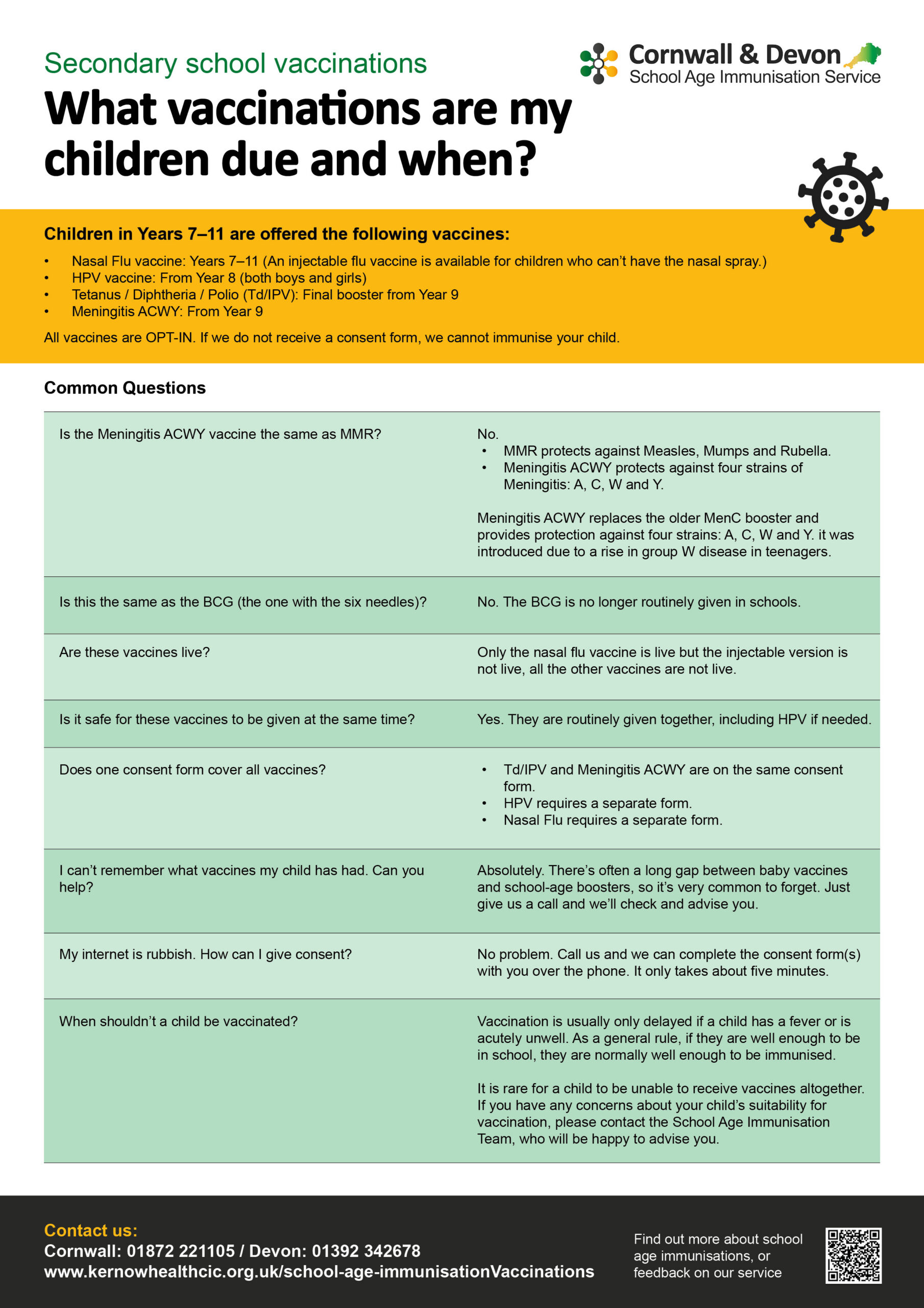 Our school-age immunisation team is responsible for the planning and delivery of the school-age immunisation programmes in Cornwall and Devon. The vaccinations programmes are primarily carried out in schools, although we also offer clinics in other community settings for home-educated children and other children depending on individual need. Below, we provide advice and information for parents, clinical staff, schools, children and young people.